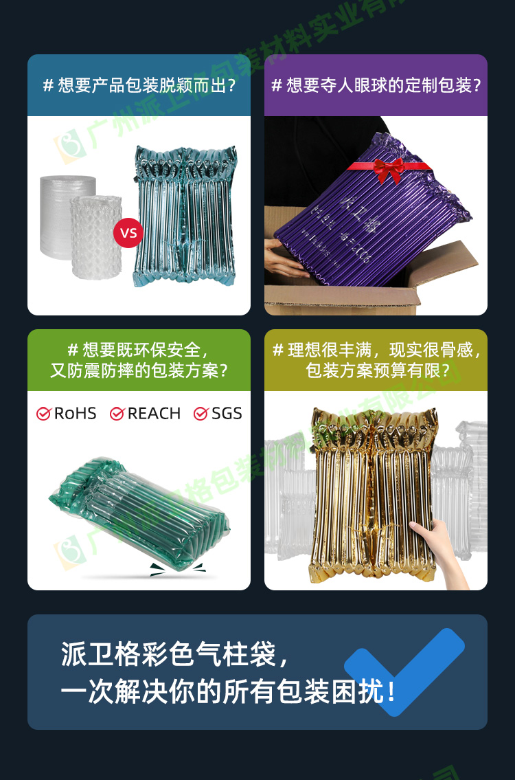 金色紅酒氣柱袋是一種特殊印刷的氣柱袋,專為紅酒瓶的包裝而設(shè)計。它采用金色外觀,既能提供有效的緩沖和保護(hù),又展現(xiàn)了高端和豪華的感覺。易于使用,可以通過簡單的充氣設(shè)備快速充氣。這種金色紅酒氣柱袋廣泛應(yīng)用于紅酒瓶、物流配送和線上銷售等場合,為紅酒的包裝和運輸提供了方便、安全和高品質(zhì)的解決方案。